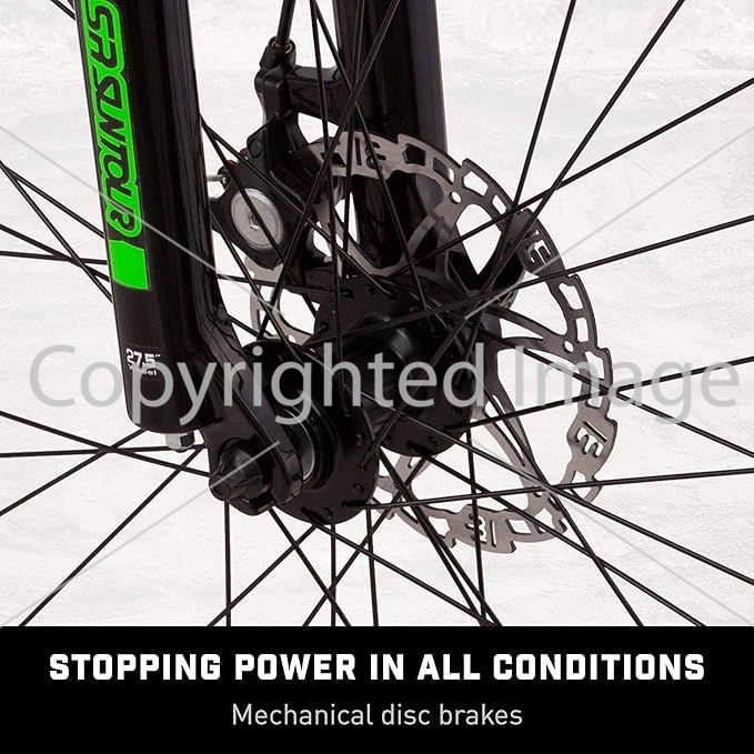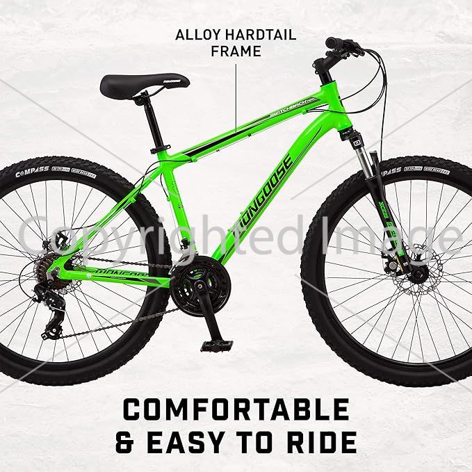 Equipped with a durable aluminum frame, the Mongoose bike is designed to withstand the rigors of off-road riding. The aggressively sloped top tube provides a lower center of gravity, enhancing stability and control, especially at high speeds.