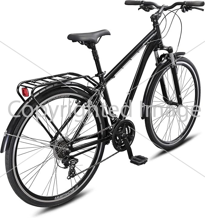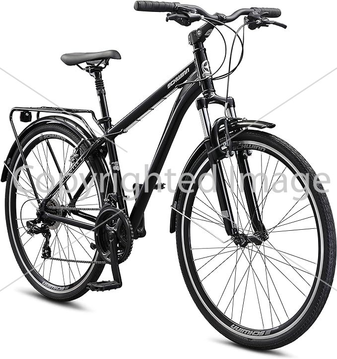 Equipped with a lightweight yet strong aluminum frame, the Schwinn bike is designed for daily commutes and weekend adventures alike. The 700c wheels provide a smooth and stable ride, ideal for both paved roads and moderate off-road trails.