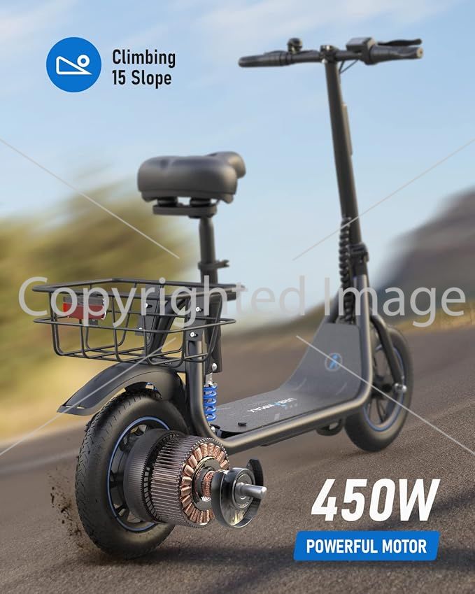 - Powerful and Sturdy: URBANMAX C1 S electric scooter with seat has a 450W brushless motor, which allows you to ride at 18.6 mph for 25 miles or to climb a 15° slope easily. This moped scooter can carry up to 265lbs, and the seat is adjustable to accommodate people from 4′9″ to 6′ tall, suitable for 12 years old and above.It has passed UL2272 certification, ensuring a more secure and reassuring use.